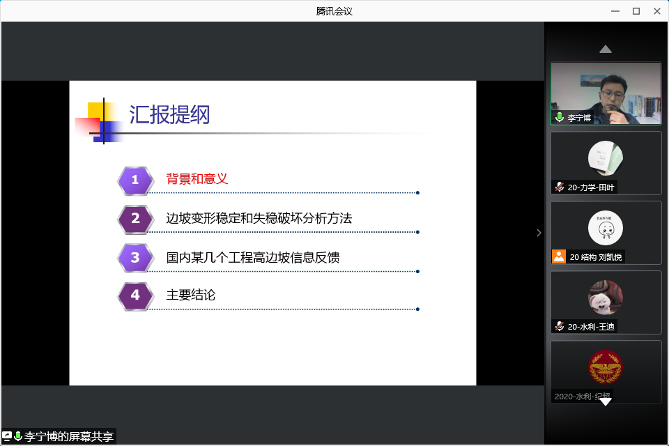 韩勃老师简单地介绍了李宁博老师的研究方向和最新成果后,李宁博老师便开始了本次汇报。汇报主要从四个部分展开:第一部分是背景和意义,李宁博老师给我们讲述了水利水电工程高边坡有边坡高陡、地应力高、地震频发等特点,也讲解了大家中国的地质灾害多发区主要以滑坡为主,每年均造成巨额生命及财产损失;第二部分是边坡变形稳定和失稳破坏分析方法,李宁博老师给我们讲述了岩坡破坏主要分为岩石崩塌、平移滑动、旋转滑移、岩块流动、岩层曲折以及各种类型发生的原因,也向大家介绍了高边坡抗滑稳定分析的一些方法,主要有刚体极限平衡法、数值流形方法、有限差分法;第三部分是国内某几个工程高边坡信息反馈,李宁博老师给我们介绍了几个典型的工程,并对工程的裂缝检测情况、边坡滑塌情况、开挖过程设计处理措施、左岸边坡地质条件进行了详细的讲解;第四部分是主要结论。