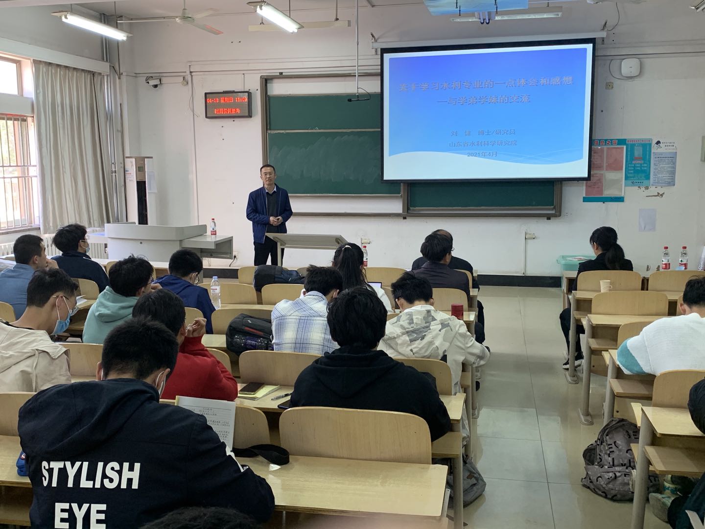日,Beat365官方网站水利工程系邀请山东省水利科学研究院供排水技术研究所副所长刘健研究员以《关于学习水利专业的一点体会和感想—与学弟学妹的交流》为题,在兴隆山校区教学楼