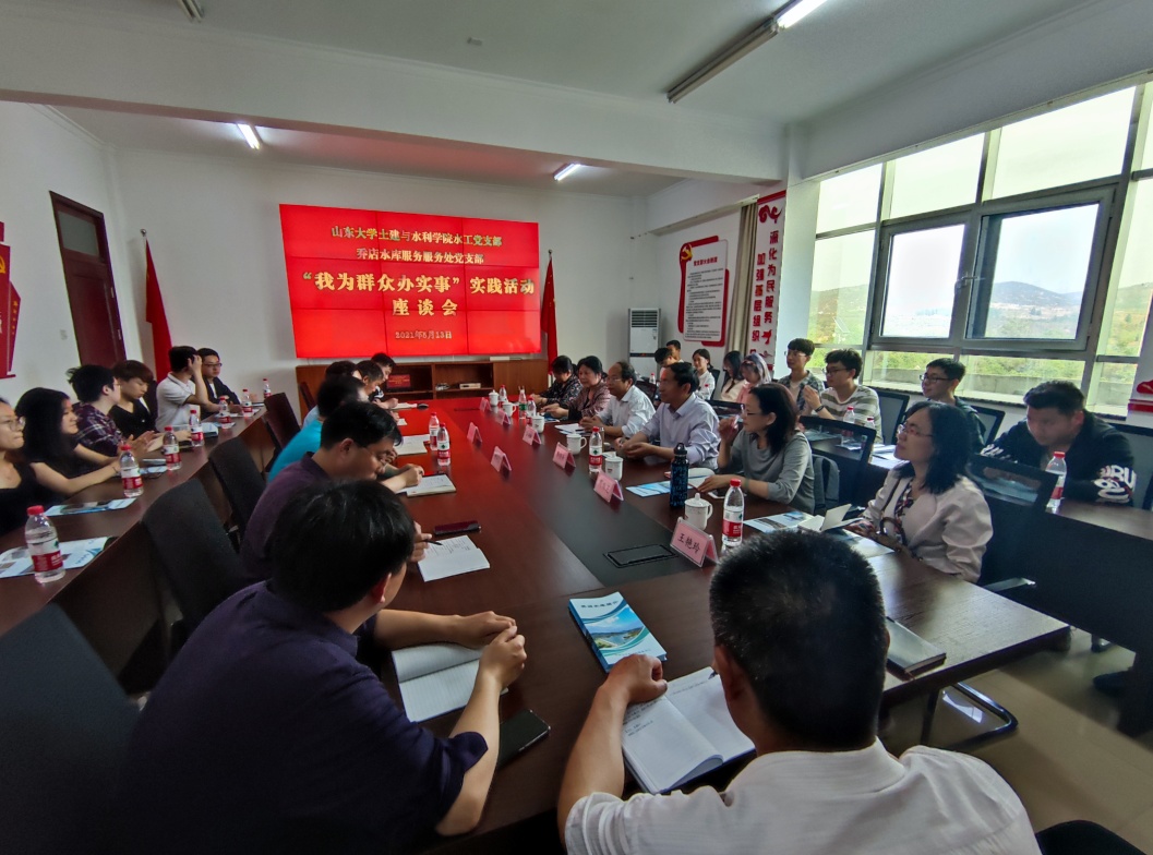 座谈会上,高长杰主任对山大师生的到来表示欢迎并向会人员介绍了参会人员与水库的基本情况,之后双方介绍了各自支部近期党史学习教育开展情况并进行了交流了经验,一致认为,学党史要与办实事开新局同向发力,努力把学习教育成果转化为提高能力、解决群众实际问题,助推工作成效的有效手段。双方围绕水源地保护、水污染防治、水库分层取水设计、水库高效多元化供水、水库信息化建设等水库运行管理方面最关切的问题进行了深入地探讨,共建双方准备在下一步针对乔店水库的实际问题积极开展课题研究,推动共建工作做实做细。