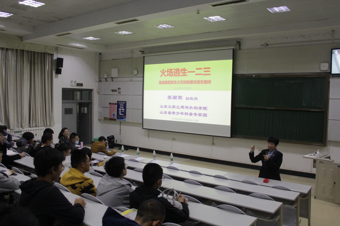 随着城市化进程的加速,高层建筑,尤其是超高层建筑,正在不断颠覆人们对建筑高度和空中姿态的认知。在这些时尚的摩天大楼里,各种专业竖井林立,如电梯井、管道井等,一旦发生火灾,这些竖井将会导致火势迅速蔓延。因此,如何在火灾蔓延速度快、扑救难度高的高层建筑里选择科学的逃生路线,就成了每个人保障生命财产安全的必修课。本次讲座与其他消防安全教育讲座不同,姜丽荣首先向同学们提出当火灾发生三连问:1.超高层建筑住户向下跑还是向上跑?2.遇到浓烟不能向下跑怎么办?3.建筑有哪些消防设计?在对这些问题的解答过程中,姜老师带领学生们认识建筑中的疏散消防楼梯、避难层、直升机停机坪等,从建筑消防设计的角度探寻发生火灾时的最佳逃生路线,以及正确的逃生措施。并再一次开展警戒教育:只有选择了科学的逃生路线,才能将生的主动权掌握在自己手里。最后,同学们纷纷发言表示通过本次讲座提升了自己防火意识,掌握了专业的逃生知识,并积极传播火场逃生知识。