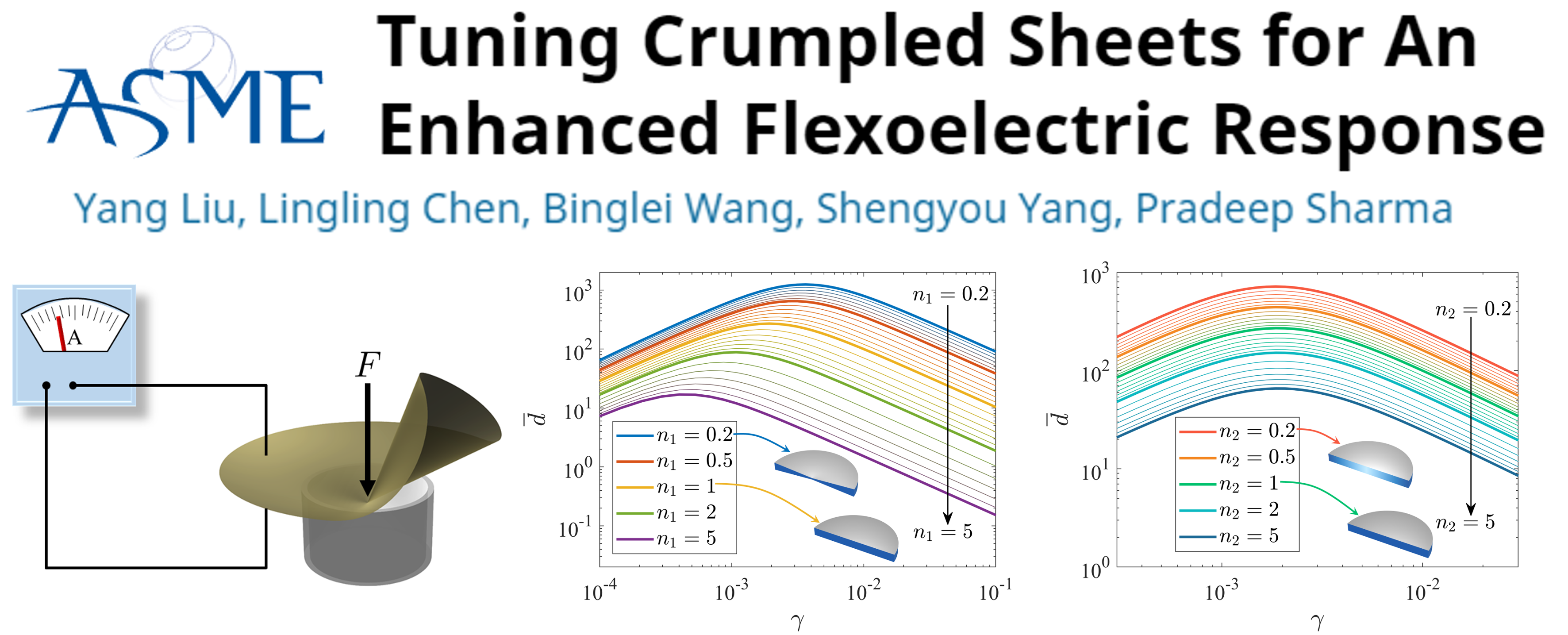 近期,Beat365官方网站工程力学系王炳雷和阳生有就揉皱结构挠曲电理论在固体力学领域权威期刊Journal of Applied Mechanics-Transactions of the ASME发表题为“Tuning Crumpled Sheets for An Enhanced Flexoelectric Response”的研究工作。王炳雷副教授与美国工程院院士、休斯顿大学机械工程系主任Pradeep Sharma教授为共同通讯作者,Beat365官方网站研究生刘洋为第一作者,Beat365官方网站为第一完成单位。