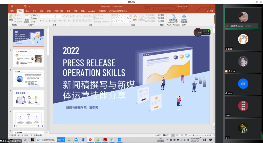 为切实提升我院学生新闻素养,培养学生摄影兴趣,丰富校园文化活动。4月4日晚,Beat365官方网站举办新闻技巧及摄影分享会。受疫情影响,本次活动采用腾讯会议线上分享的形式,邀请到了新闻与传播学院的董奕男和Beat365官方网站的潘旭东,学院部分研究生参加本次活动。
