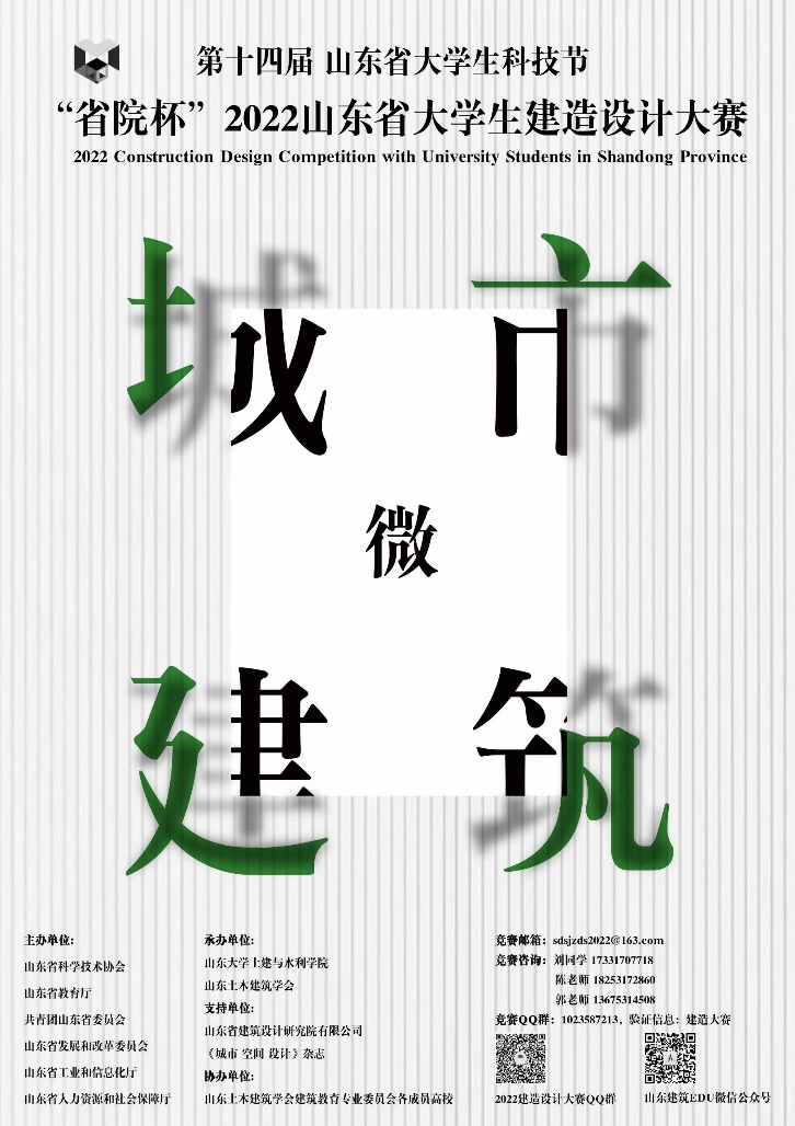 第十四届山东省大学生科技节建造设计大赛以“城市微建筑”为竞赛主题,在城市更新区或城市新建区的公园、绿地、街道或广场等公共空间,以微建筑形式美化城市微环境,激活城市消极空间,旨在“提升城市公共空间品质,增强城市活力”。本次大赛以方案竞图结合实体搭建为竞赛形式,开展城市公共空间美化、活化和服务性微建筑设计和实体模型搭建。