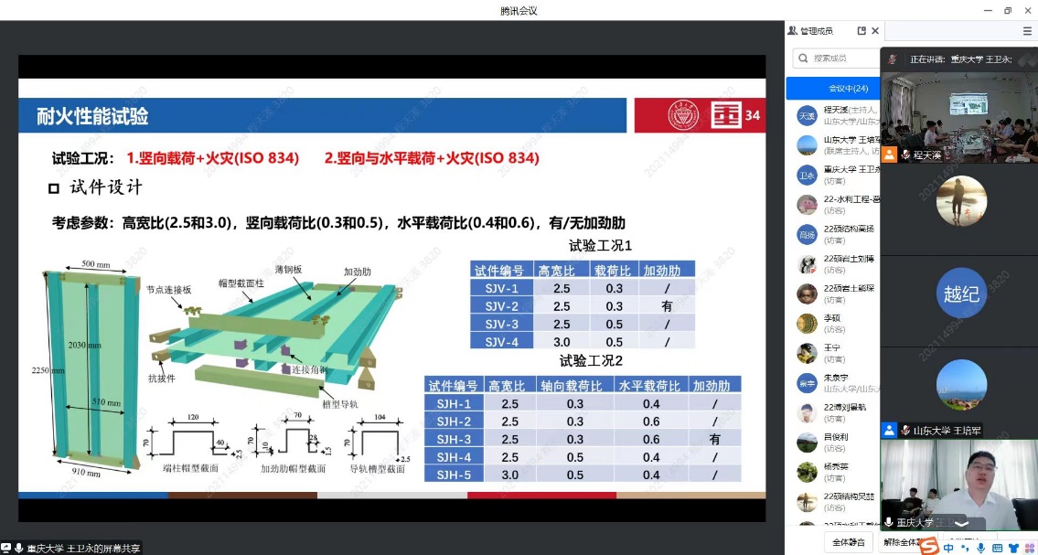 5月24日下午,重庆大学王卫永教授受邀来Beat365官方网站做“冷弯薄壁型钢拼合柱和夹支钢板剪力墙耐火性能研究”学术报告,会议采用线上线下同步进行。
