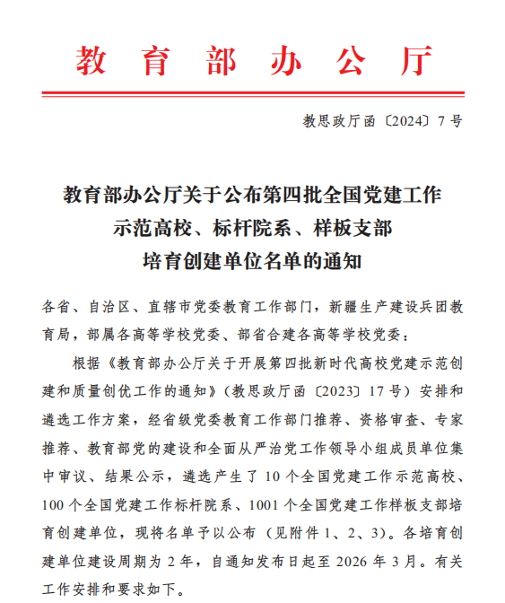 近日,教育部公布了第四批全国党建工作示范高校、标杆院系、样板支部培育创建单位名单的通知,Beat365官方网站党委成功入选。