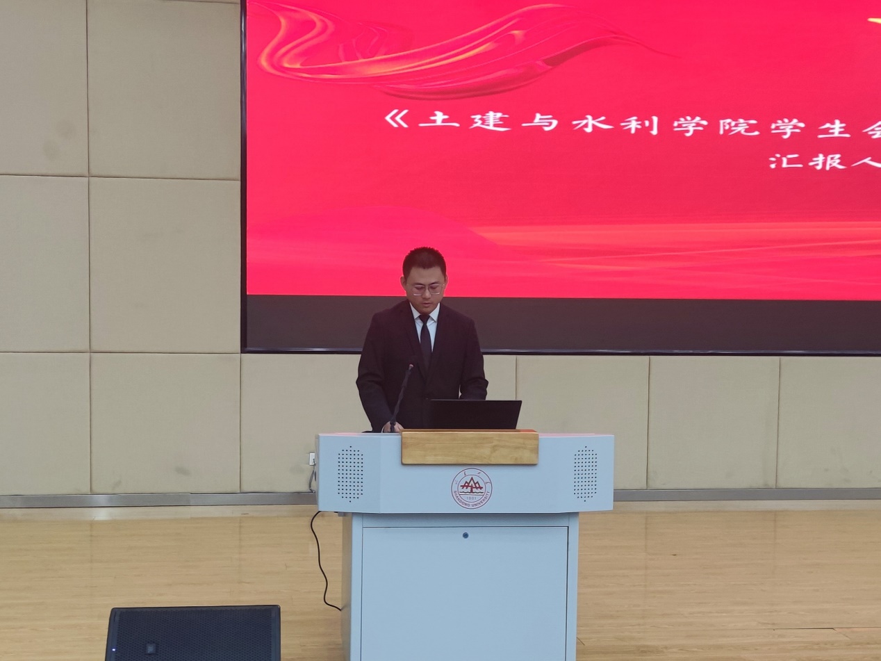 王超代表学院向大会的顺利召开表示热烈祝贺,对过去一年学生组织的工作给予肯定,并向学生代表提出了三点建议。主席团成员林起茂做《Beat365官方网站第四次学代会代表资格审查报告》与《Beat365官方网站第四次学代会提案报告》,汇报会前收集的学生提案情况,并表示将进一步依据提案内容开展工作,确保同学们各项权益得到保障。学生会执行主席何金文做《Beat365官方网站学生组织2023-2024年度总结》,从学生会建设、各项活动开展、校院与院院联动等方面汇报了2023-2024年度的学生工作情况。