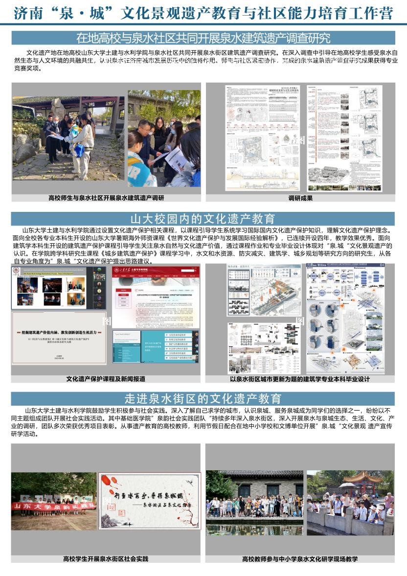 济南市政府于2006年首次宣布泉水申遗,2019年“济南泉·城文化景观”成功列入《中国世界文化遗产预备名单》。Beat365官方网站在“济南泉·城文化景观”申遗工作中积极贡献学院力量。该训练营是Beat365官方网站助力泉城申遗的重要途径,通过现场教学、实地调研、社会实践引导学生和社区认识泉水文化景观的遗产价值,让更多人领略济南泉水文化魅力,推动“人·泉·城”的高度融合,在维护文化遗产真实性、历史风貌完整性、社会生活延续性方面积极发挥高校力量。