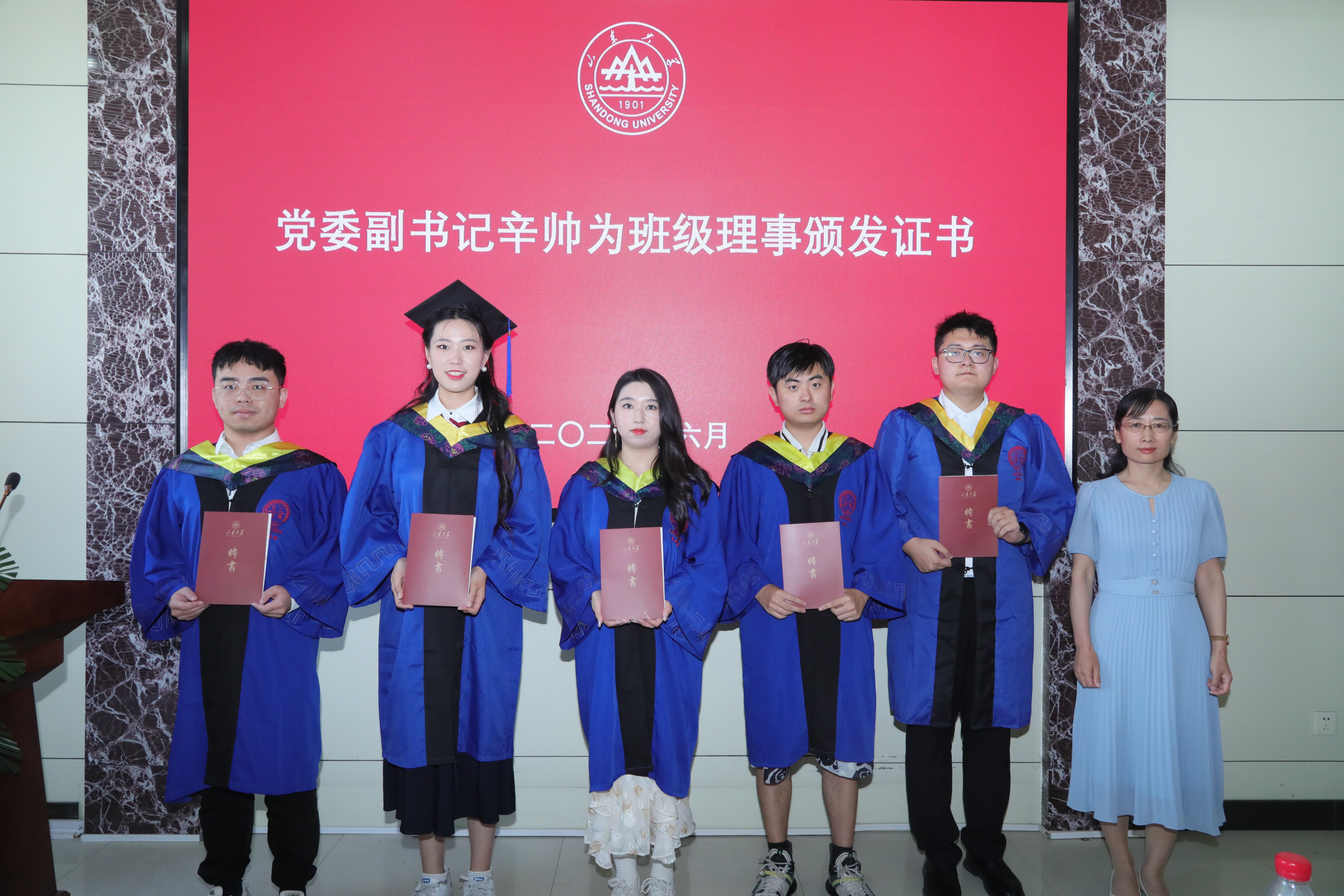 传承山大文化,汇集磅礴力量。为加深毕业生与母校的联系、赓续同学与老师的情谊,党委副书记辛帅为班级理事颁发聘书并合影留念。