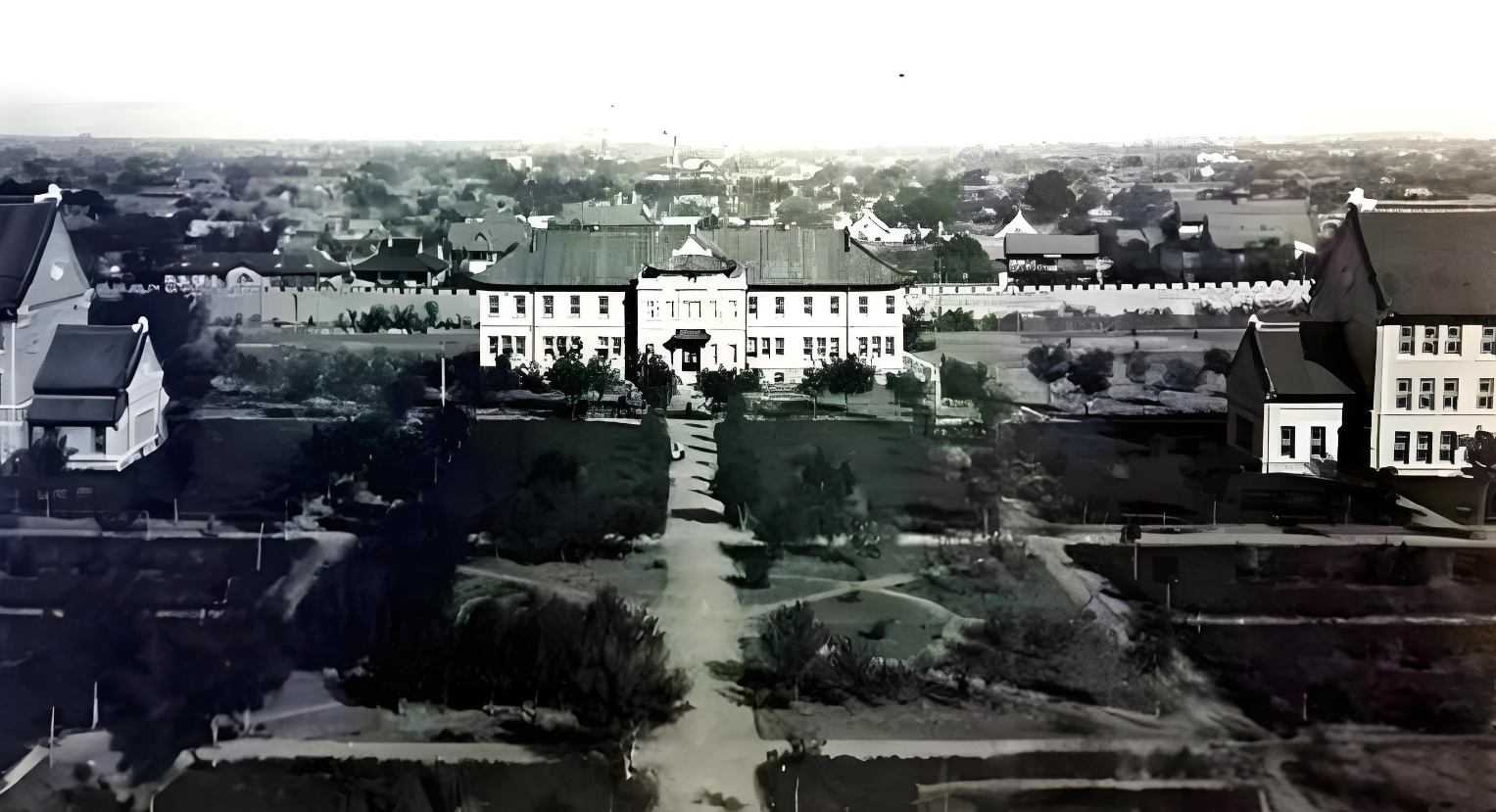 (1924年,校园中心广场景观,左为柏根楼,右为考文楼,中间为麦柯密古楼,既现在的主楼位置。原处济南石圩子城墙及济南古城清晰可见。)