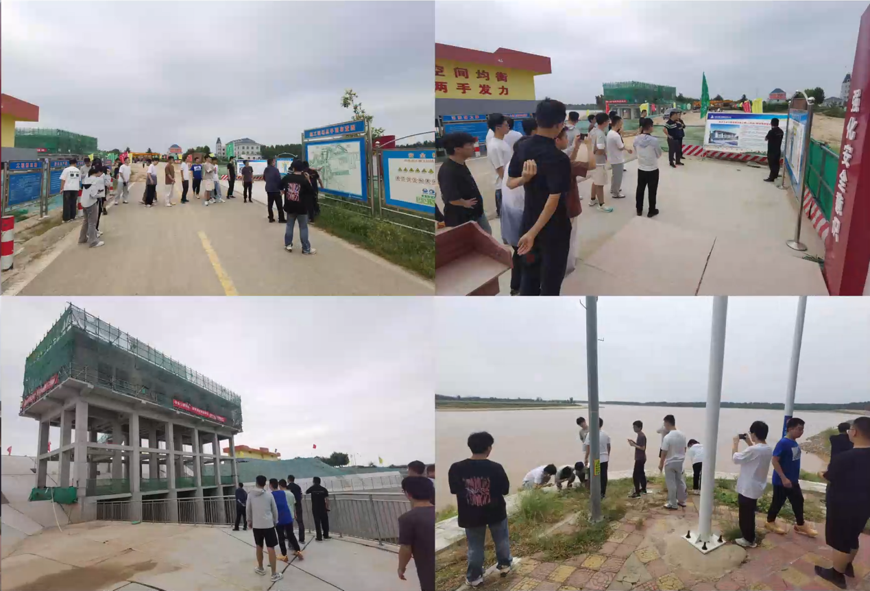 随后,同学们先后前往第七站出湖闸和穿黄工程管理处,通过图文、讲解和现场参观,同学们对南水北调东线穿黄河工程有了更为全面深刻的认识。在黄河岸边的守望展板处,师生们伫立观看学习,被王跃进、王永胜等人在工程建设现场的坚守忠贞精神深深感染。通过现场参观和学习,同学们对南水北调东线输水干渠、东平湖和黄河的关系有了更直接地认识,深刻体会到了调水工程的重要性和运行管理中的复杂性。