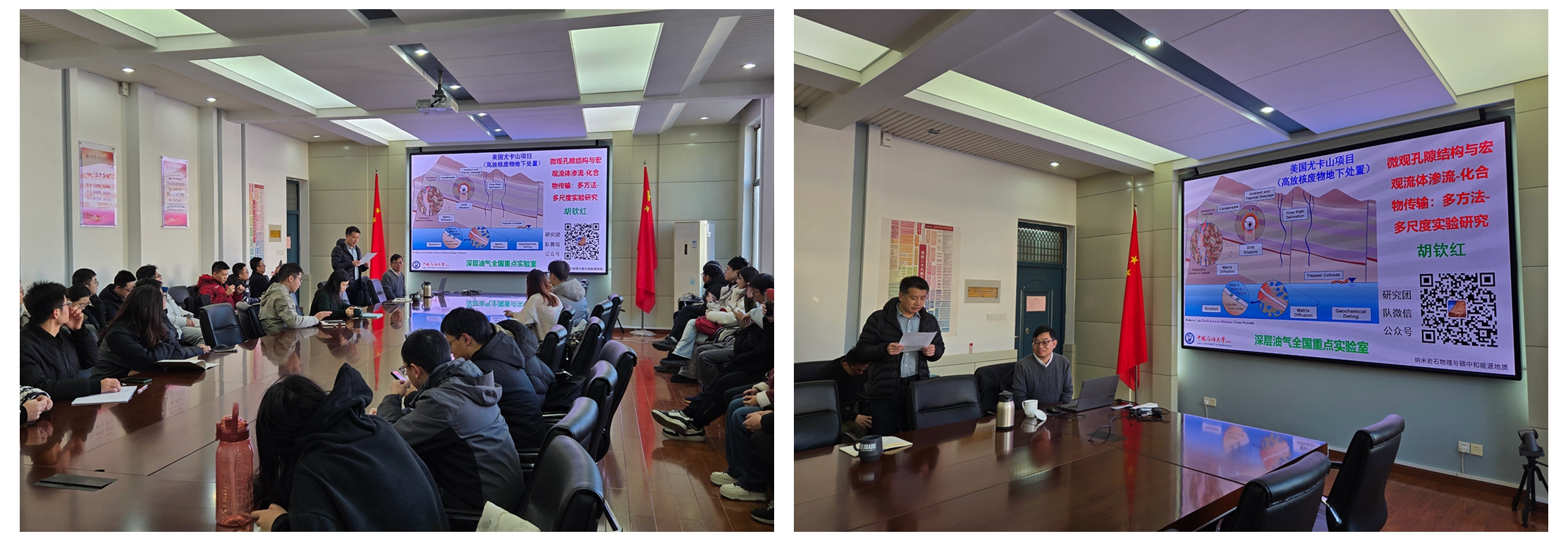 活动伊始,毛德强对胡钦红教授表示热烈欢迎,并向参会师生介绍胡钦红教授的研究领域及学术成果。胡钦红教授介绍了自己在土壤农化、土壤环境化学、污染物水文地质等领域的学术背景与研究经历,以及在国内外多所知名高校与科研机构的任职情况和所获荣誉。随后,他详细阐述了其研究团队在能源地质与环境地质领域的研究方向与成果,如页岩油气储层“五性”评价、热-流-力-化-生耦合过程等,展示了团队在纳米孔隙岩石物理、基质-裂缝相互作用等方面取得的突破性进展。