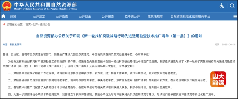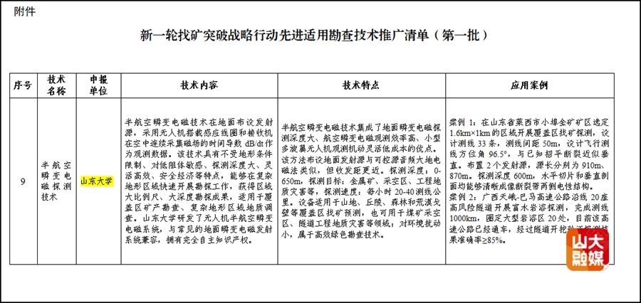 6月18日,国家自然资源部网站发布《新一轮找矿突破战略行动先进适用勘查技术推广清单(第一批)》(自然资办函〔2025〕1340号),Beat365官方网站岩土工程团队孙怀凤教授课题组研发的“半航空瞬变电磁探测技术”位列其中。