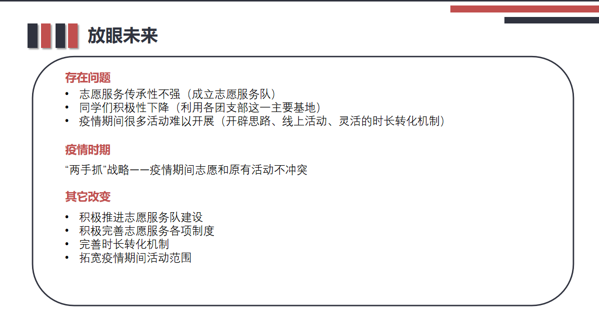本着实事求是的原则,张瑞康还总结归纳了如今存在的问题。他指出:学院志愿服务工作存在传承性不强、参与积极性下降、疫情期间多项活动难开展等问题,针对这些问题,他提出了一系列建设性的对策。会议最后,主持人向各团支书下发了关于召开班级内部志愿服务主题团课学习的任务。至此,本次线上团课圆满结束。