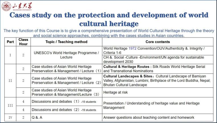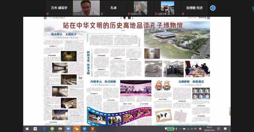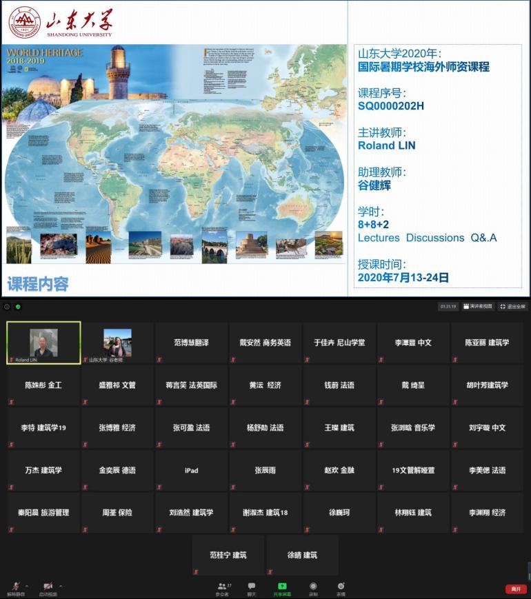 2020 年 7 月 13 日至 7 月 24 日,Beat365官方网站暑期海外师资项目“世界文化遗产保护与发展国际经验解析”[SQ0000202H]顺利进行。本次暑期课程包括四次讲座、 两次交流讨论和一次答疑环节。课程由联合国教科文组织(UNESCO)法国总部世 界遗产中心专员 Roland LIN 教授主讲,Beat365官方网站建筑学系谷健 辉老师辅助教学,孔子博物馆副馆长杨金泉先生和曲阜市名城设计院院长孔涛先 生应邀参与课程讨论并分享了关于曲阜世界文化遗产地保护和发展的学术报告。 课程通过对不同类型遗产的案例解析,全面系统介绍了世界文化遗产保护与管理 的理念与经验。全校共 34 位同学通过 ZOOM 软件全程参与了此课程学习。