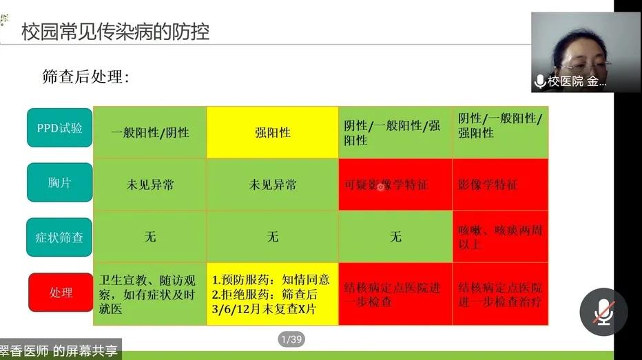 金医生首先结合今年我国新型冠状病毒肺炎的防治情况和新冠病毒的研究进展,为与会同学深入浅出地讲解了新冠病毒的病原学特点和流行病学特征。金医生强调,人群普遍易感染新冠肺炎,感染后或接种新冠疫苗后可获得一定的免疫力,但是持续时间尚不明确。因而同学们一定要遵守疫情常态化防控下的个人防护规定,戴好口罩,保持社交距离,勤洗手。金医生同时给同学们介绍了疫情防控的国家和地方政策,讲解了疫情常态化防控下的应急处置规定。