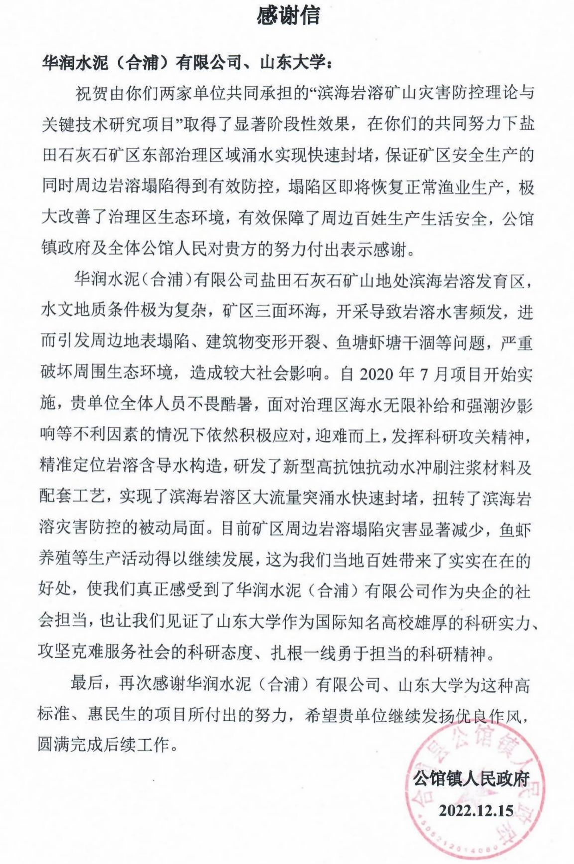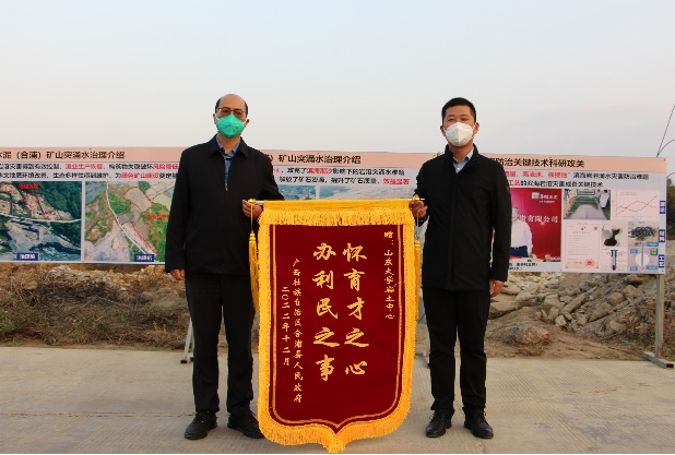 经过一个水文年监测,矿山治理区域无海水渗漏,周边区域岩溶塌陷得到有效控制,受损渔业恢复生产,极大改善了矿区生态环境,为当地带来了显著的经济效益和社会效益。合浦县人民政府对此高度重视,特组织县、镇政府领导现场查验治理情况,对Beat365官方网站的精益求精的专业精神、严谨的科研作风、敬业奉献的工作态度予以表彰,对项目取得的阶段性科研效果高度认可,特致函表示感谢并赠予锦旗鼓励。