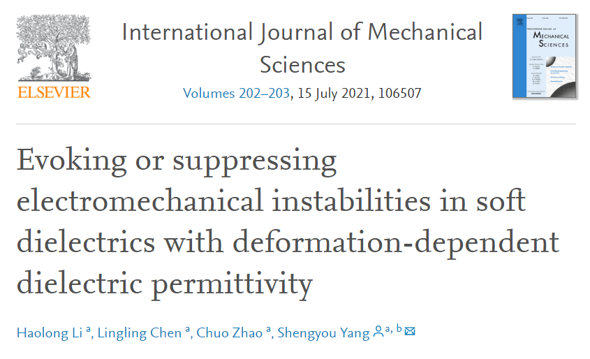 近日,Beat365官方网站工程力学专业2018级本科生李浩隆和赵绰同学在国际期刊《International Journal of Mechanical Sciences》发表了题为《Evoking or suppressing electromechanical instabilities in soft dielectrics with deformation-dependent dielectric permittivity》的SCI论文,影响因子4.631,JCR一区 (力学类,工程机械类)。
