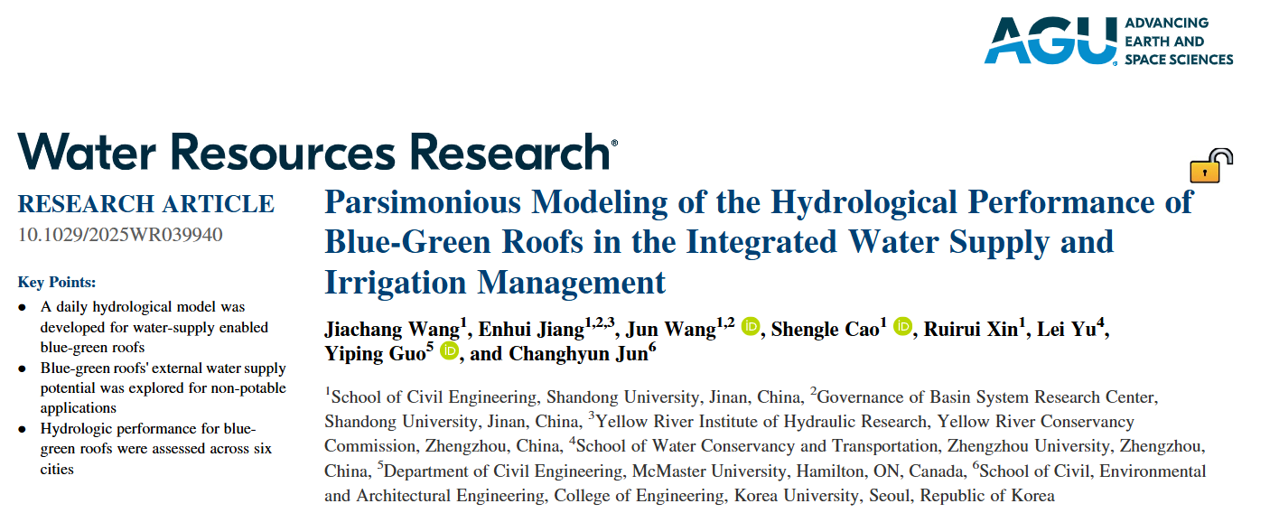论文信息:Wang, J., Jiang, E., Wang, J., Cao, S., Xin, R., Yu, L., Guo, Y., & Jun, C. (2025). Parsimonious modeling of the hydrological performance of Blue‐Green roofs in the integrated water supply and irrigation management. Water Resources Research, 61(7). https://doi.org/10.1029/2025wr039940