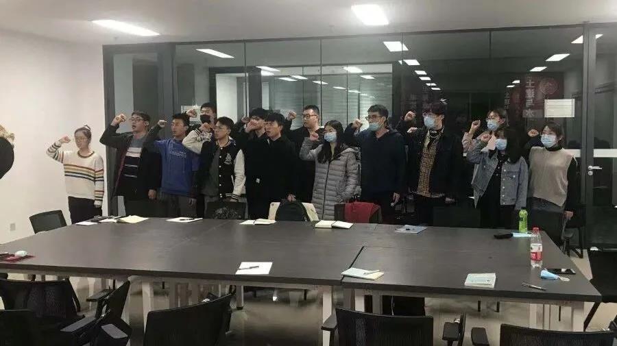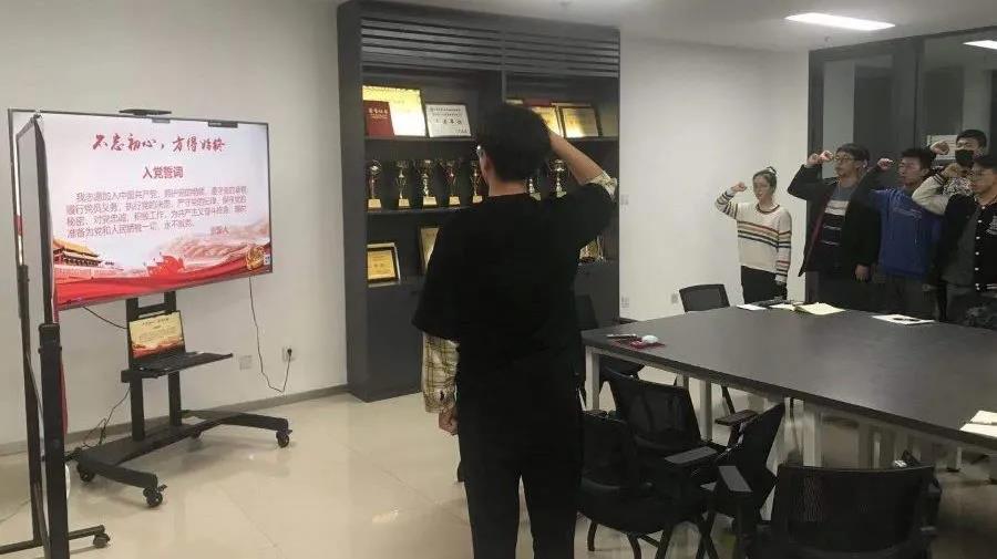 伴随着激昂的曲调,会议室奏响了国际歌。全体党员面向党旗,在郭章潮的带领下全体预备党员右手握拳面朝党旗,庄严宣誓,在场党员重温了入党誓词。