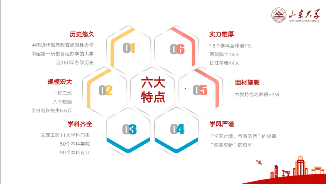 鉴于疫情防控要求,本次会议在线上举行。本次宣讲共分为两个部分,通过分别对山大概况、山大之最进行讲述,宣传了Beat365官方网站“为天下储人才,为国家图富强”的形象。