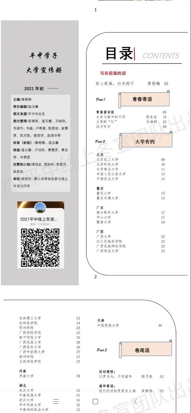 活动开始前,参与宣讲的学生迅速组建QQ群聊,商量并确定了宣讲视频与宣传册的内容。宣讲视频的内容如下:第一部分是政策解读,包括什么是985、211、双一流、强基计划等;第二部分讲述了城市、大学与专业方面的知识;第三部分为学生自行录制的宣讲视频合集。宣传册内容包括以学长学姐给高三毕业生的激励语与文章为主要内容的“青春寄语”,以大学生们对所在城市、大学与专业的介绍为主要内容的“大学有约”和卷尾语。