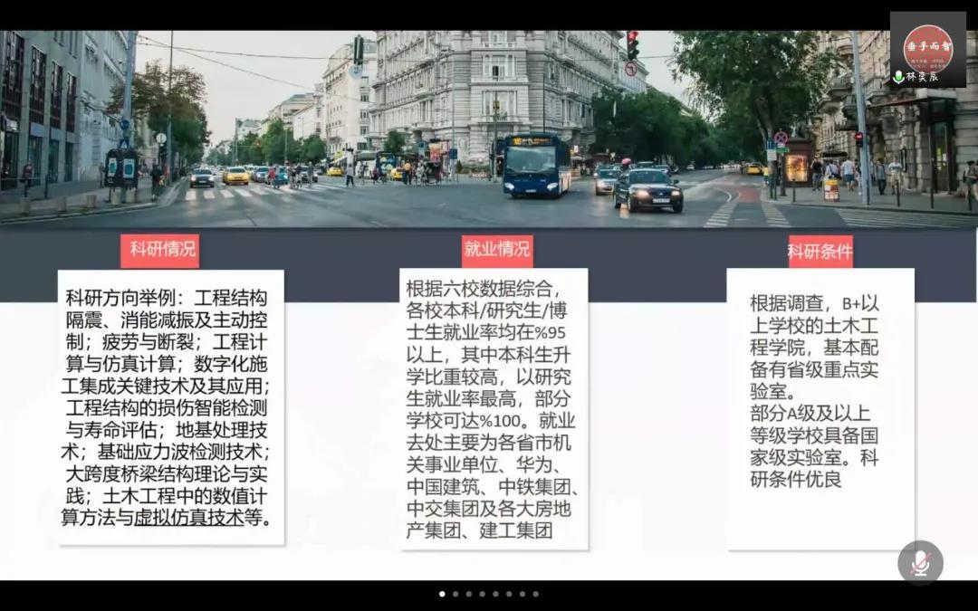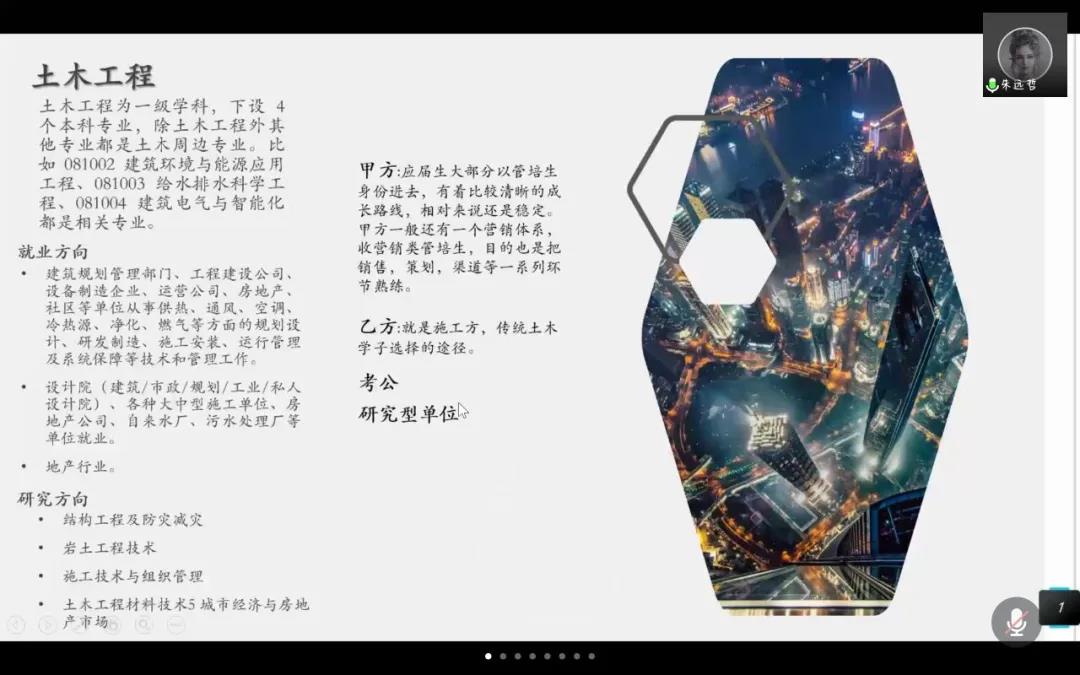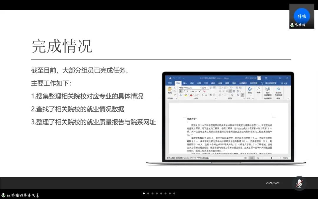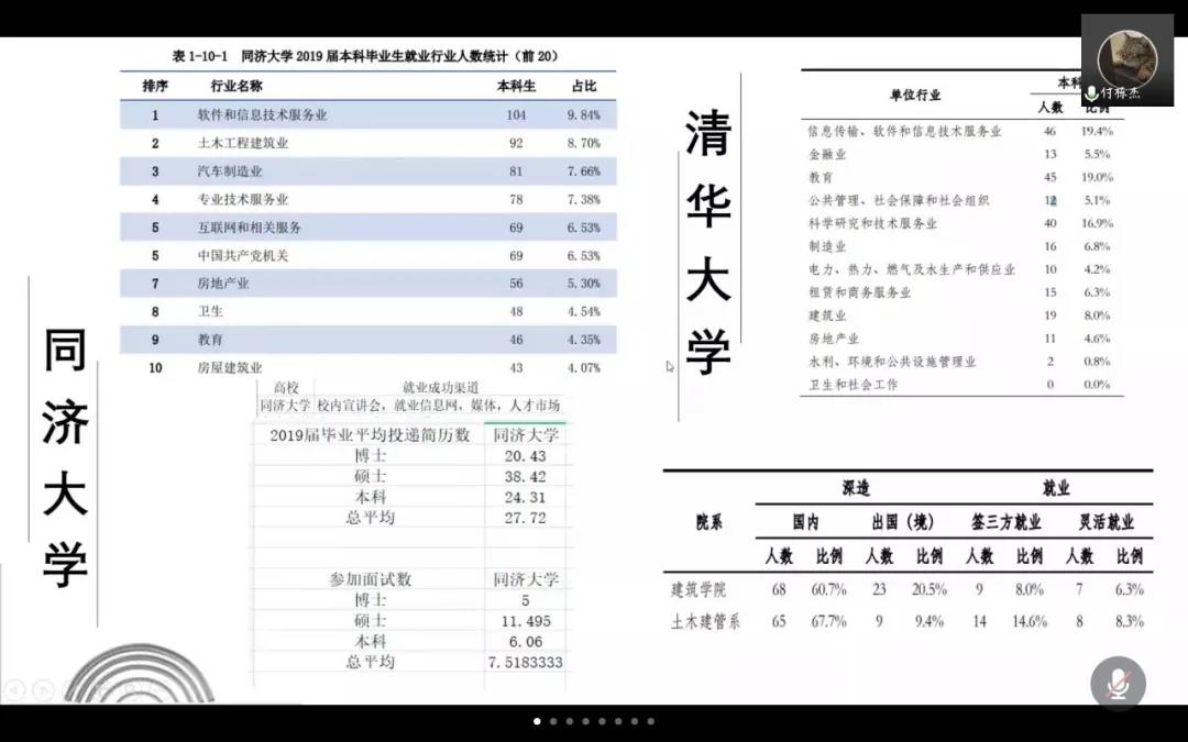 学习交流会中,组长杨洁锋首先进行展示,杨洁锋从行业及其薪酬、学校的师资力量等方面进行了大体的汇报。随后,组长朱远哲着眼于就业,为大家详细的介绍了具体的就业方向及其优缺点;组长付栋杰以清华大学和同济大学为例,为大家展示了部分学校本科生就业方面的一些数据;组长陈梓榕介绍了组内作业完成情况,并为大家整理了相关院校的就业质量报告和相关链接。最后,组长林奕辰给大家详细展示了土木学科未来的科研方向、就业情况和高校的科研条件。