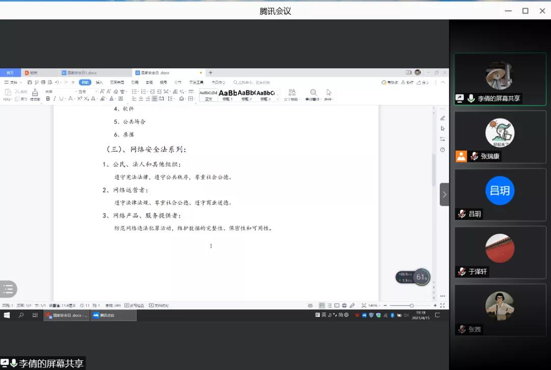 为提高同学们的国家安全意识,深入学习贯彻习近平总书记提出的“总体国家安全观”,4月15日晚,Beat365官方网站本科生第一党支部土木党小组于线上开展“国家安全记心间”主题会议。会议由张瑞康同志主持,全体党员、预备党员参加。