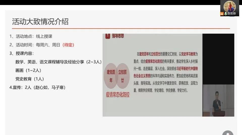 会议伊始,岳孜烨就14日上午召开的Beat365官方网站暑期社会实践培训会作出了总结与反馈,主要为同学们重温了外出实践的安全事项与新闻媒体宣传工作所需注意的问题。其次,岳孜烨就本次社会实践所反映出来的问题做了一定的调整,并对之后所需要进行的工作进行了展示。岳孜烨指出,本次社会实践活动需紧跟党史,在注重支教所带来的基础教育之外,还需加强学生的党史学习教育。同时,支教教育也应重视学生的兴趣发展,岳孜烨提出将团队成员的专业优势与支教教育相结合,为学生提供绘画方面的教学,尊重并培养学生的兴趣发展,更加符合支教的意义所在。会议最后,团队成员们开始对实践活动的任务进行了分配,并开始积极投入到实践活动准备工作中。