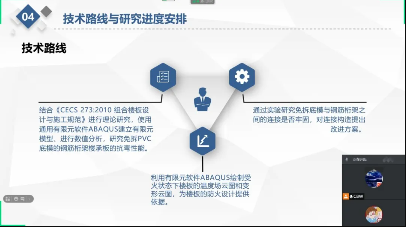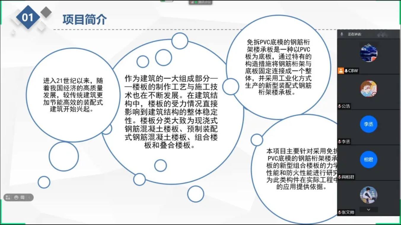7月19日,Beat365官方网站“免拆PVC底模的钢筋桁架楼承板研发与抗弯性能研究”创新创业社会实践团利用腾讯会议进行第一次团队会议暨活动启动仪式。本次会议主要进行项目整体介绍、具体任务进度确认、近期相关工作分配等活动。