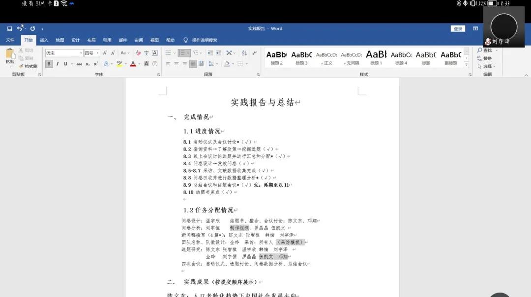 会议的第二项,是全队成员的实践成果展示。在短短十天时间里,队员们积极搜查资料,激烈讨论交流,走入社会,采访各类家庭,并以线上线下相结合的方式开展对三胎问题的探究。陈文东选题研究的是“人口老龄化趋势下中国社会发展去向”以及“各地区人口老龄化差异成因”;张智棋选题研究的是“三胎政策实施对住房的影响”;温宇欣和刘宇泽共同研究“父母受教育程度对三胎政策的影响”、“三胎政策对当代教育环境的影响”以及“国家应对三胎教育问题的相关政策”;罗晶晶选题研究的是“三胎政策引发关于育龄妇女权益的思考”;刘宇恒选题研究的是“家庭经济情况对生育三孩意愿的影响”;韩楠选题研究的是“三胎政策对未来家庭结构和社会就业环境的影响”金晔选题研究的是“三胎政策目前已有的相关配套政策”。