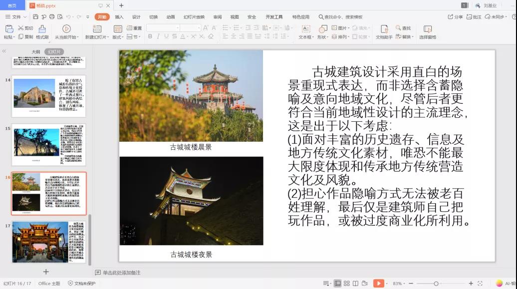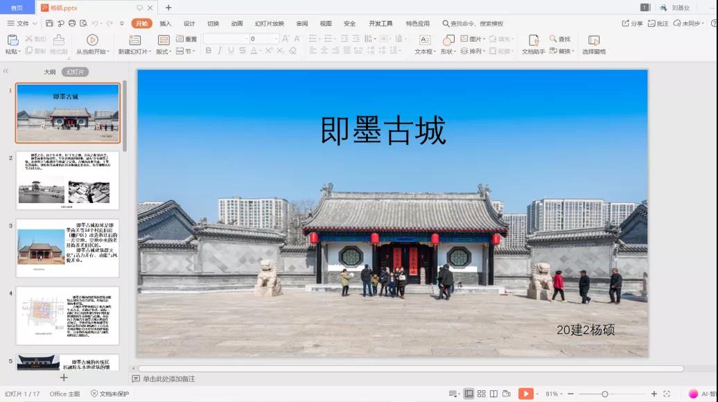 会议伊始,杨硕对即墨古城的实地调研成果进行了汇报。通过对即墨古城的实地走访调研,杨硕从古城建筑特征、空间格局方面切入分析,向队员们展示出古城建筑群文化与活力并存,功能与风貌并重的独特风貌以及古典艺术的魅力。接下来,针对古城文化近年来的的发展,杨硕表示近年来即墨古城内不仅容纳了本地原有的历史、文化和民俗菁华,也不断吸引、包容和孕育着当代多元文化,多类型文化都在此处觅得了舞台。最后,杨硕鼓励同学们学好专业知识,以新眼光重新认识家乡,品味风土人情,更好地传承和表达地方的文化风貌。