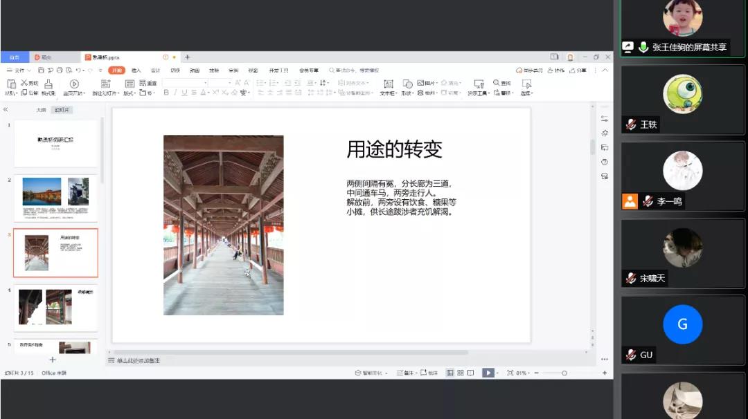 8月20日,下午15时,Beat365官方网站“寻筑”调研团于腾讯会议举行第四次线上分享会,对社会实践成果进行汇报。队长李一鸣主持会议,成员张王佳驹对浙江省金华市武义县熟溪桥调研的相关内容展开分析汇报,成员宋啸天、张钟华、王轶以及指导老师谷建辉参与本次分享会。