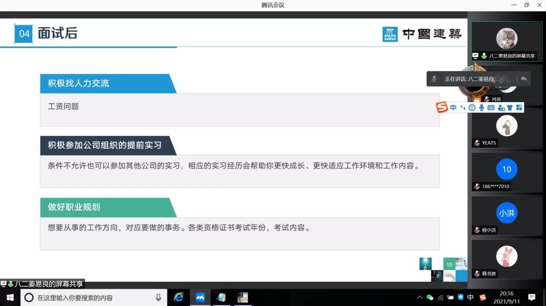 9月11日晚8时,Beat365官方网站“学长学姐说”就业经验分享会顺利举行。会议由Beat365官方网站2018级辅导员助理肖英和金霄主持,邀请了2017级土木工程毕业生就职于中建八局二公司姜易良和就职于中建八局华北公司吕玥担任分享嘉宾,18级全体同学参加。