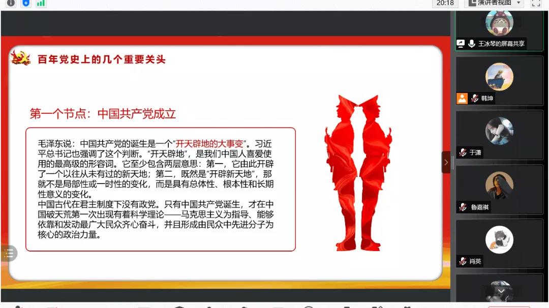 接着,王冰琴同志从百年党史的几个重要关头入手,着重介绍了“新中国的成立”、“改革开放”以及“坚持中国特色社会主义道路”等六个节点,说明我国的改革一直是在通过总结新的经验、采取新的措施而不断推进和深化的,我国的社会主义制度一直是在通过确立新的体制、机制和新的具体制度而不断地完善和发展的。随后,她总结了新时代党和国家事业的历史性成就,并分享了自己在学习这段历史时的启示。