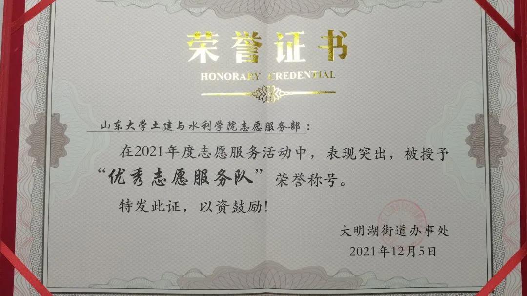 2020年8月至2021年12月,Beat365官方网站志愿服务部联合大明湖党群服务中心,以“用最初的心,做永久的事”为指导思想,开展爱心义卖、社区楼道清洁、红色讲堂系列活动等志愿服务活动。活动开展过程中志愿者们以梦想成就梦想,向社会传递温暖与感动,推动了社区的和谐发展,受到社区居民的一致好评,并以优异的活动表现被大明湖街道办事处授予优秀志愿服务队荣誉证书。