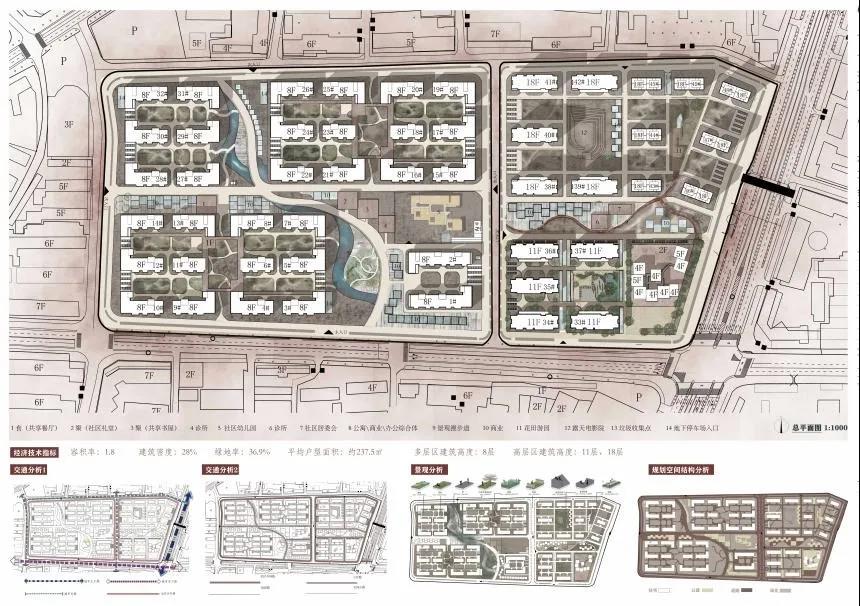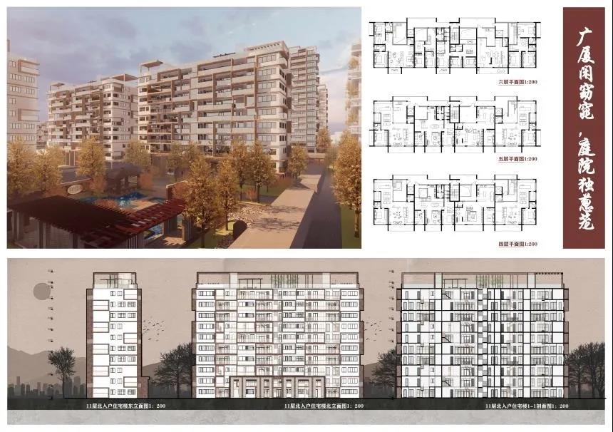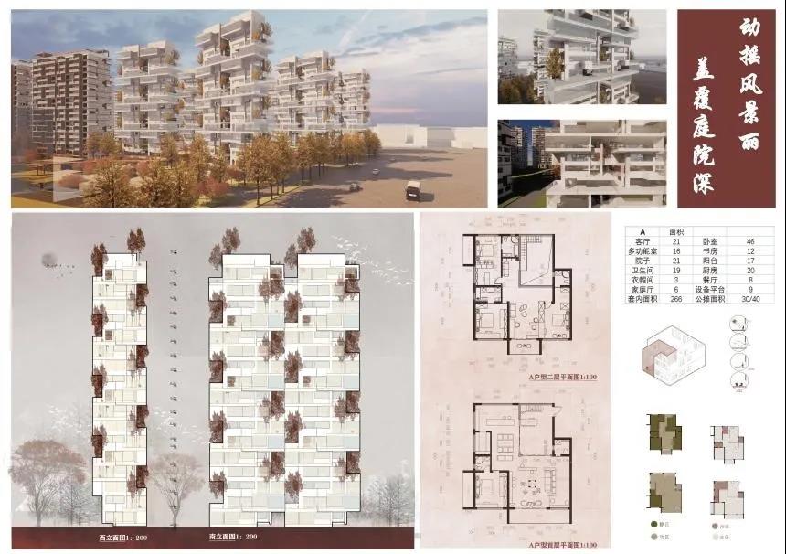 田佳鑫的作品分为住区规划设计和高层住宅楼设计。住区规划设计通过解读老济南容易形成熟人社会的典型空间结构特征,对其进行现代语汇翻译和优化,贯穿在社区规划中,通过营造院落空间与传统“归园田居”生活当中的“商”、“读”、“耕”、“聚”、 “憩”的特色空间,力求保留并加强社区的熟人社会氛围,让居民享受到现代济南的惬意的“田居”生活。