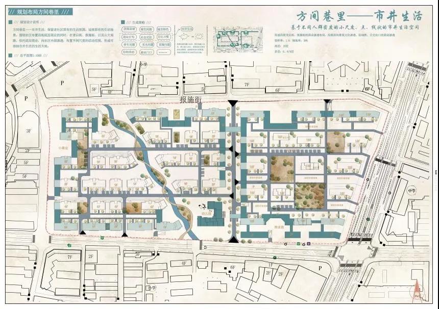 围绕社区布置沿街底层商业的同时,在青后街、报施街、以及山大南路,依托底层商业,向社区内凹内部渗透,形成不同的活动场地。在内部依托街巷布置不同尺度的活动绿地,形成可容纳市井生活的生活天地。