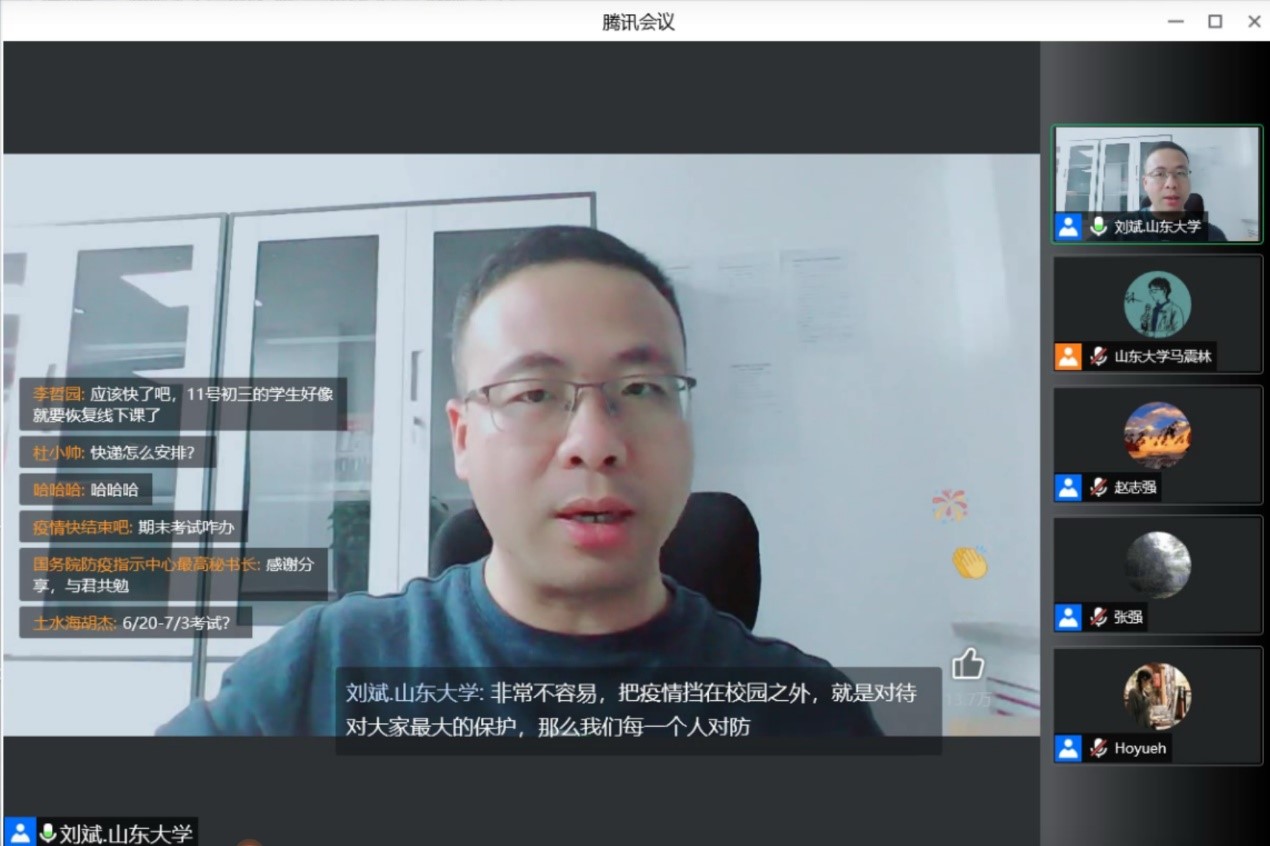 会议伊始,刘斌代表学院向各位同学表达了诚挚慰问和深切问候,为封校期间同学们勇敢担当、积极配合的举动点赞,指出大家充分展现了当代大学生的青年风采。随后,刘斌结合学校疫情防控工作安排,向全体本科生传达了山东省疫情防控会议精神,并嘱咐同学们作为新时代青年要做到4个坚决,即要坚决坚持动态清零总方针、坚决认清疫情防控形势、坚决落实好防疫重任、坚决坚守直到防疫胜利。他嘱咐同学们要充分利用封校契机磨练自身意志,始终保持高昂饱满的学习热情和刻骨钻研的科研精神,自觉开展体育锻炼,劳逸结合守护身体健康,对大家疫情防控期间遇到的各种问题,学院也将尽最大努力满足学生的合理需求。