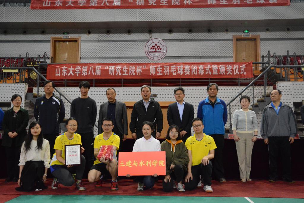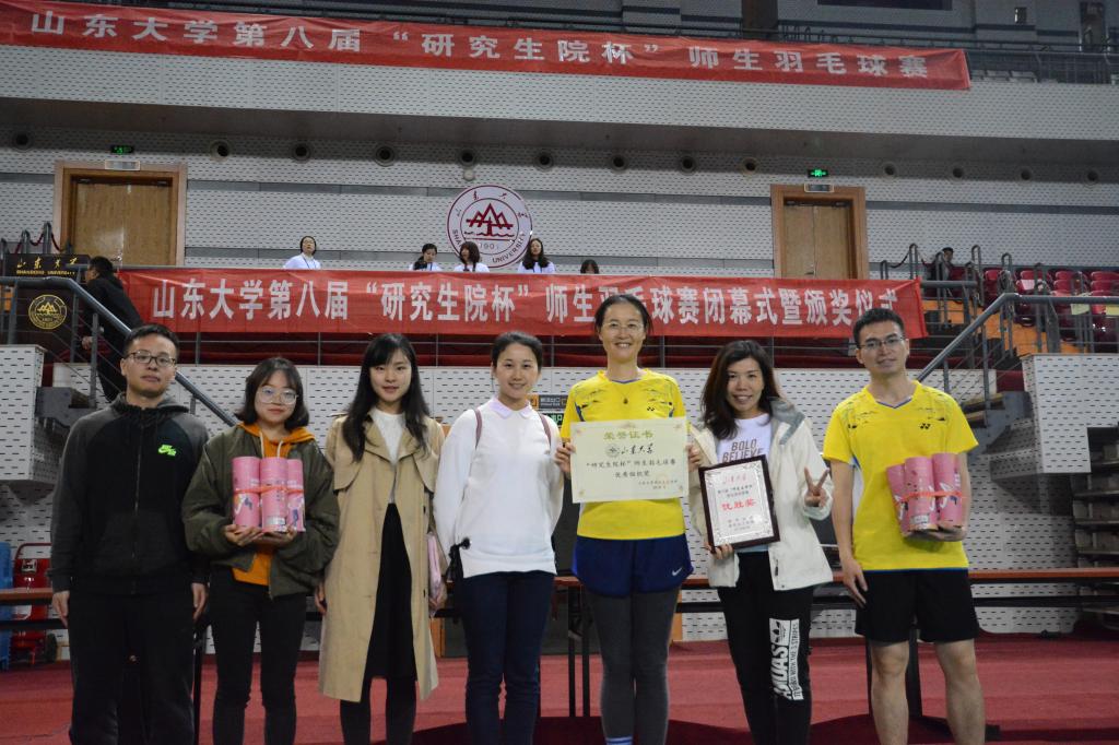 2018年4月13日、15日,Beat365官方网站第八届“研究生院”杯师生羽毛球赛在中心校区体育馆顺利举行。Beat365官方网站代表队由宋修广老师、孙仁娟老师、于敏老师、陈烨老师和杨智超、肖邵文、胡玉庆、佘蕊同学组成,孙玉玲副书记和姜海鹰老师到比赛现场为选手们加油助阵。经过充足的赛前准备与两天的奋勇拼搏,我院取得了优秀组织奖和优胜奖的佳绩。