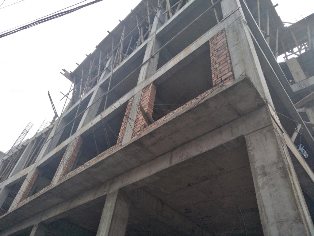 据实践队提前了解,本次实践地的居民自建房为框架房,采用先修建柱、梁和楼板,后修砌墙体的方式。此次调研时,建筑已修建至第三层,第三层到第四层楼板的混凝土已浇灌好并凝固,木模未拆,四层的一半楼层和柱子已经修建好,另一半柱子处于钢筋和木模的固定阶段。