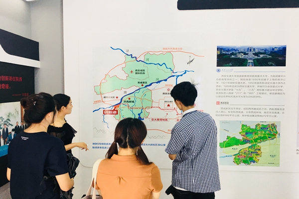 在沙盘前,我们清晰、直观地了解到创新港的整体布局以及最后呈现出来的效果图。创新港位于西咸新区沣西新城范围内的渭河南岸,周围的两条高速线路和地铁5号线的两个站点把创新港和西安市区高效地连接了起来。整体布局上分为四大板块,即科研板块、教育板块、转孵化板块和综合服务配套板块。其中的核心区域——科研教育板块,将由西安交通大学来组建工、理、医、社科四大方向23个研究院,容纳12000名研究生和6000名博士生。创新港将现要建设“校区、镇区、园区、社区”四位一体的创新体、技术与服务的结合体、科技与产业的融合体,成为我国高等教育改革的交大样板、中国特色城镇化的西咸样本。