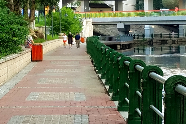 接着,队员们来到了位于南岗区的马家沟河继续开展调研工作。马家沟河是松花江干流南岸支流。20年代以后,随着经济发展,城市人口增多,环保措施不力,非雨季时马家沟河流水全部是污水,成了“污水河”。改革开放后,1992年国家计委综合整治工程开始启动。将昔日的臭水沟变成清水河,成为市民游玩、休闲、度假的场所。队员采访了过往的居民,队员们得知,经过政府的治理之后,马家沟河已经基本让附近的百姓满意,今日的马家沟河河水清澈、两岸树木繁茂,已经成为人们休闲娱乐、运动健身的好去处。