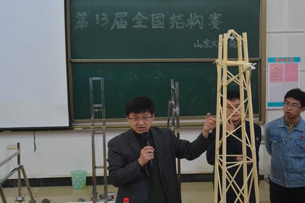 段抗就比赛中存在的问题进行了点评。他指出,在作品的固定阶段,模型底端的稳固至关重要,防止加载过程中底座脱落。他还向同学们讲述了桁架结构与其他力学方面的专业知识,并鼓励大一学生在今后的学习过程中积极探索,不断完善知识体系,对结构和力学有更深入的理解。王培军则结合较为出色的参赛作品给出了相关建议,强调在模型制作过程中要关注所学知识与实际情况的融会贯通,并及时向老师请教,在更为专业的指导下不断优化改进。