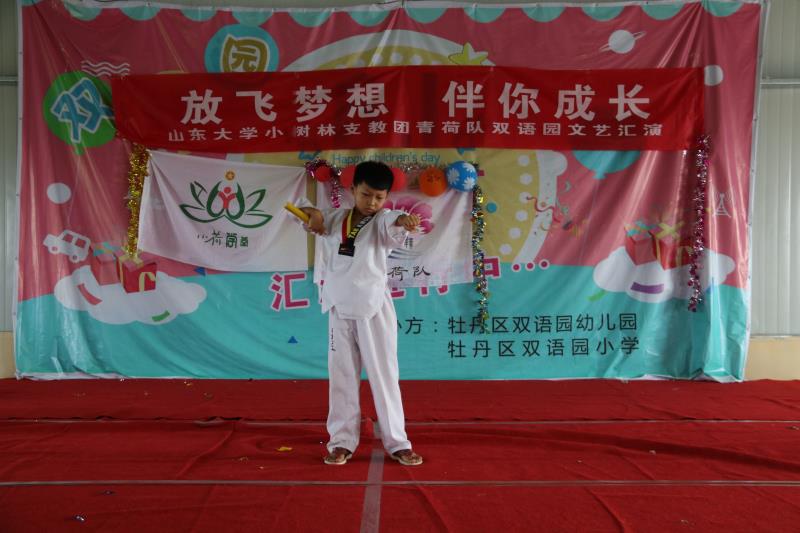 汇演伊始,青荷队队长黄少君发言,黄少君 代表各位队员,对于学校家长对支教工作的支持和信任表示感谢,对23 天工作的总结,这些天老师们认真备课认真上课,在这短暂的时光里,各施所长,各尽所能为学生提供优质的课堂,想尽办法给学生更多的引导,尽职尽责,不断成长。最后黄少君祝福各位同学学业有成,前程似锦。随后各个年级各个节目精彩纷呈,学生发挥自己的特长带来各式各样的表演,展现了与课堂不同的一面。舞蹈迸射着少年的活力,而武术同样有着迷人的魅力。武术是中国的精魂,千百年来,武术被作为强身健体,伸张正义的民族象征,是带有东方气息的文化瑰宝 。牡丹区还是武术之乡,为此三年级同学带来的武术表演,领略中华文化的博大精深。