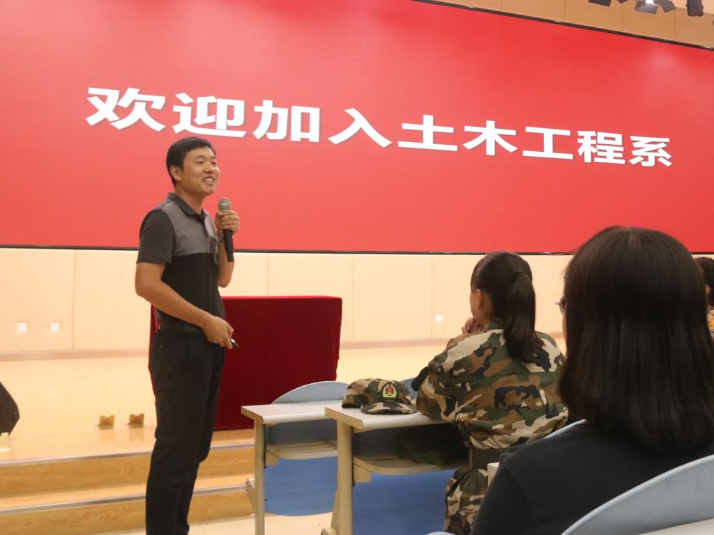 会议伊始,田利首先从发展历史、师资力量、专业排名等多个方面对山大土木工程系进行了详细介绍,充分展现了土木工程系的强劲实力和深厚底蕴。接着,田利向新生们介绍了土木工程专业的就业形式和发展前景,并展示了众多优秀校友。他表示,土木工程专业就业范围广,就业稳定度高,是发展前景良好的一门学科。提到大学阶段的学习,田利以高层建筑的建造过程为例,鼓励新生们踏踏实实走好大学的每一步,将土建人严谨务实的优秀品质不断传承下去。此外,田利还介绍了“产+学+研+赛”的培养模式,鼓励新生积极参与科研项目和科创竞赛。最后,田利祝在座同学能够度过充实的大学时光,在广阔天地中大有作为,实现人生理想。