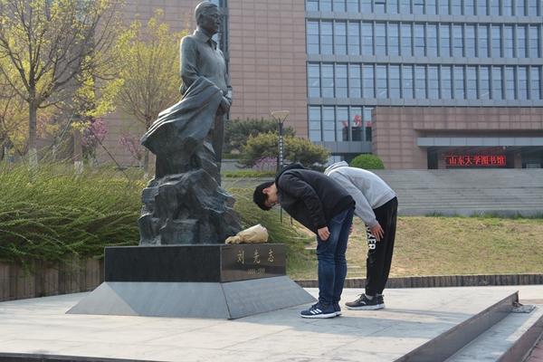 活动伊始,在庄严肃穆的氛围下,杨旭腾以庄重缓慢的语调向刘先志先生致以悼词。刘先志先生结缘山大、热爱山大、奉献山大,在Beat365官方网站辛勤耕耘三十余载,历任教授、教务长、副院长,为学校的教学、科研、管理等各项工作作出了卓越贡献。他一生追求真理,勇攀高峰,成就卓著,堪称科研表率。纵然先生早已远去,但他知行合一、爱国无畏的光辉精神,及其艰苦朴素、逆境中开拓的意志,都值得同学们借鉴和学习。全体同学肃立默哀一分钟,向刘先志先生致以崇高的敬意,依次有序地向刘先志先生雕像敬献鲜花与贺卡,并鞠躬缅怀,表达深切的敬仰。杨旭腾号召同学们继承发扬刘先志先生不懈追求真理的求知精神和鞠躬尽瘁的奉献精神,秉承哀思,铭记教诲,为提升自我,投身社会主义建设而努力奋斗。