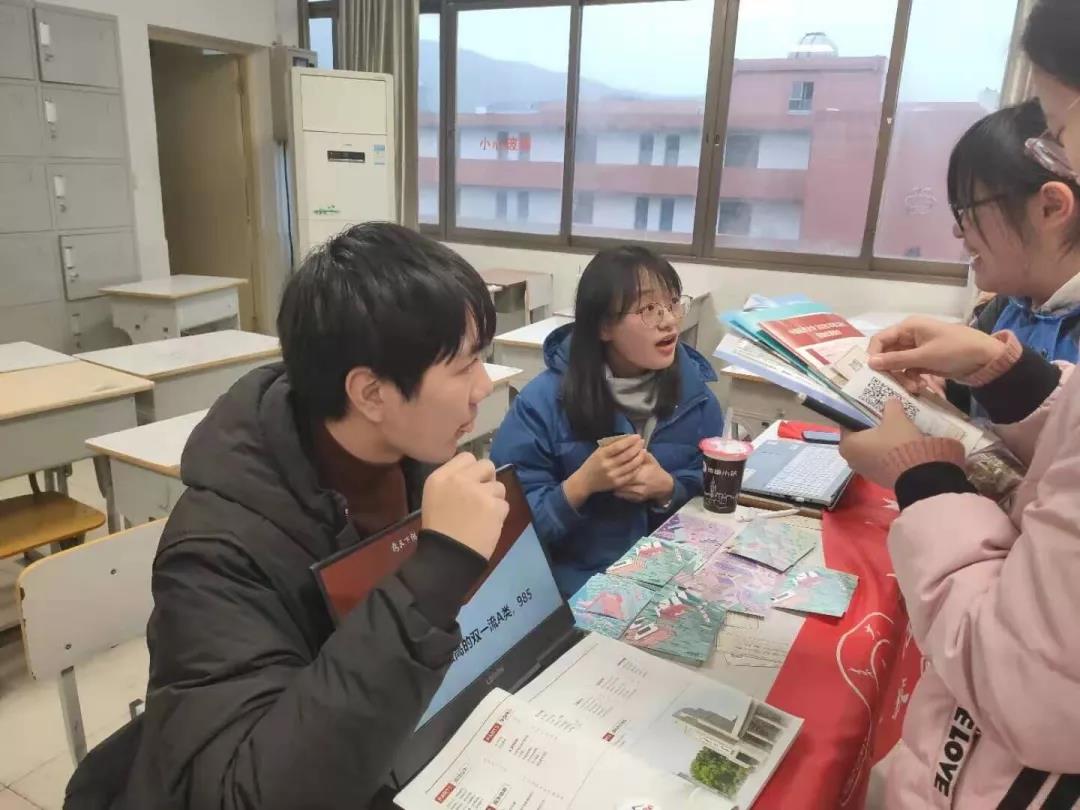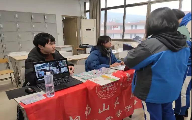 活动开始前,山大回访组在安排的教室进行了相关布置,如贴横幅,准备《Beat365官方网站2019报考指南》和Beat365官方网站宣传视频,摆小礼品等。活动开始,进入教室的附中高三学生络绎不绝。在教室里,刘子扬在电脑上播放宣传视频,以此来吸引高三学生前来咨询。王子瑶和在校学生进行了有趣的互动,送出了由“Beat365官方网站学生在线”制作的以山大各校区为主题的明信片。