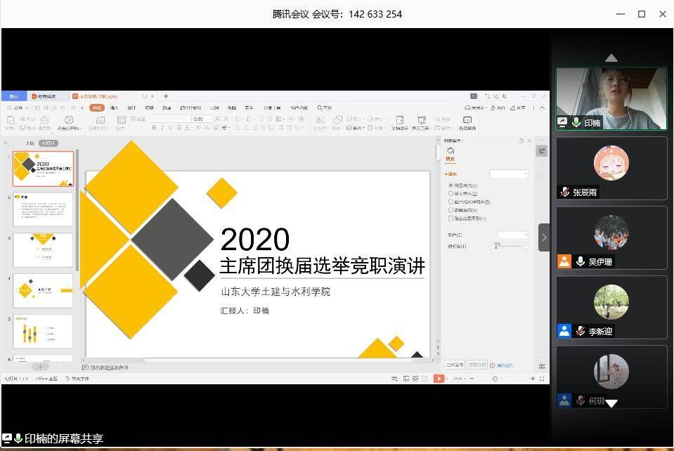 6月4日,Beat365官方网站于线上召开了2020-2021学年学生组织换届选举大会。Beat365官方网站党委副书记张强,团委书记梁莹,2019级辅导员何玥,2018级辅导员李新迎出席本次选举大会,学生会副主席吴伊珊主持本次大会。换届大会分为主席团选举和部长团选举两部分内容。