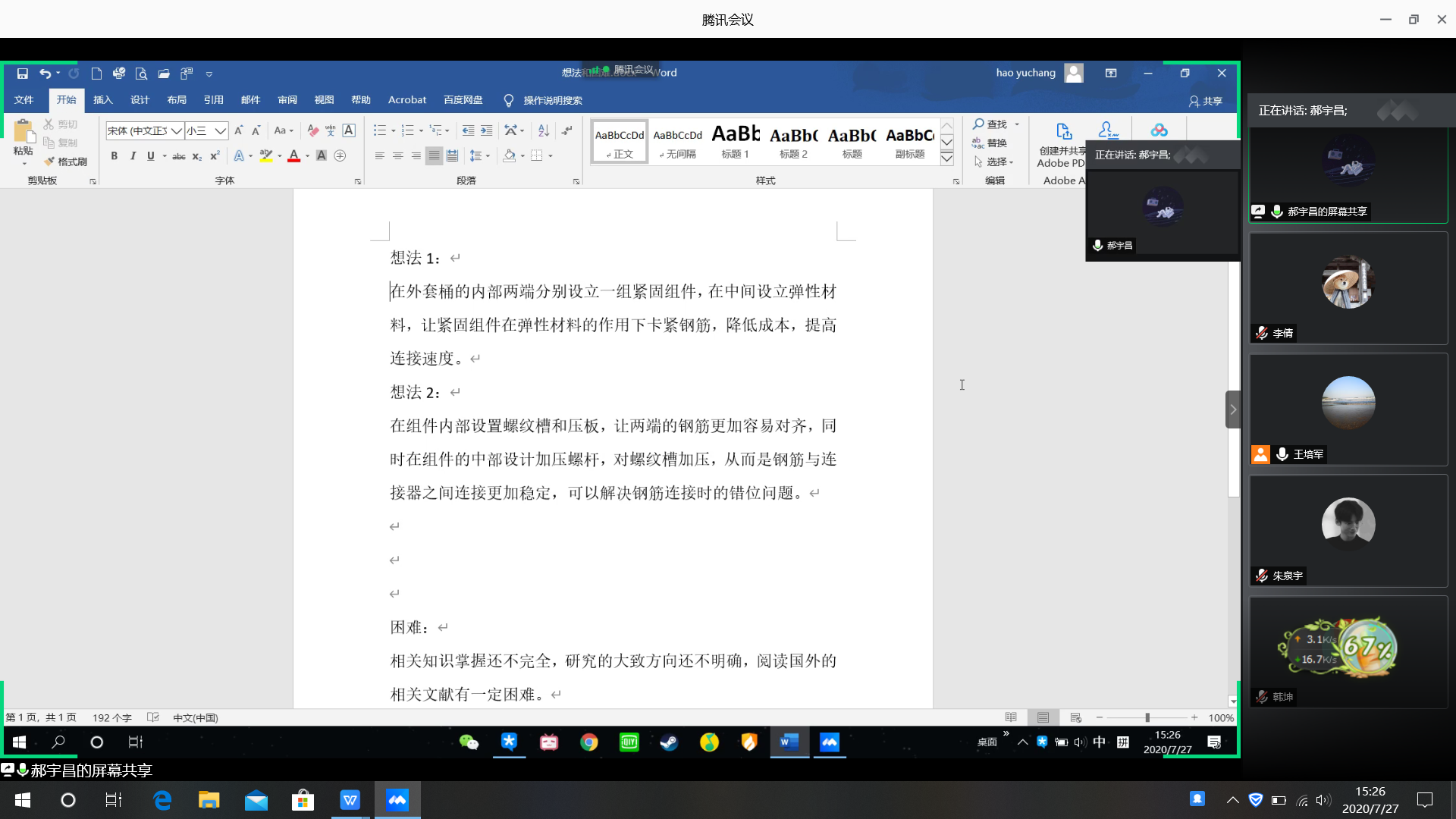 7月27日,Beat365官方网站“研发一种装配式混凝土构件用钢筋连接件”创新创业实践调研团队召开线上研讨会。会议由指导老师王培军出席,队长朱泉宇主持,全体团队成员参加。