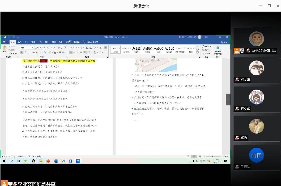 7月27日,Beat365官方网站关于社区公共空间生活质量分析调研团于线上召开启动会议。本次会议由队长李亚文主持,全体团队成员参加。